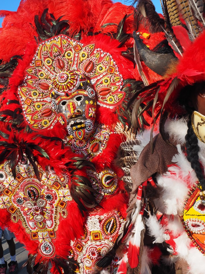 Black Masking Indians often dedicate a piece of their Mardi Gras suits to deceased loved ones. Every year, Resa “Cinnamon Black” Bazile would paint “R.I.P. Matt Matt” on Boutte’s face, in memory of the Big Queen’s son Matthew who was shot and killed. As the new Big Queen of the Spirit of the Fi Yi Yi, Mardi Gras 2021 would have incorporated a tribute to Boutte sewn on her suit or painted on her skin. But since parades were banned this year, she said she will wait until next year.